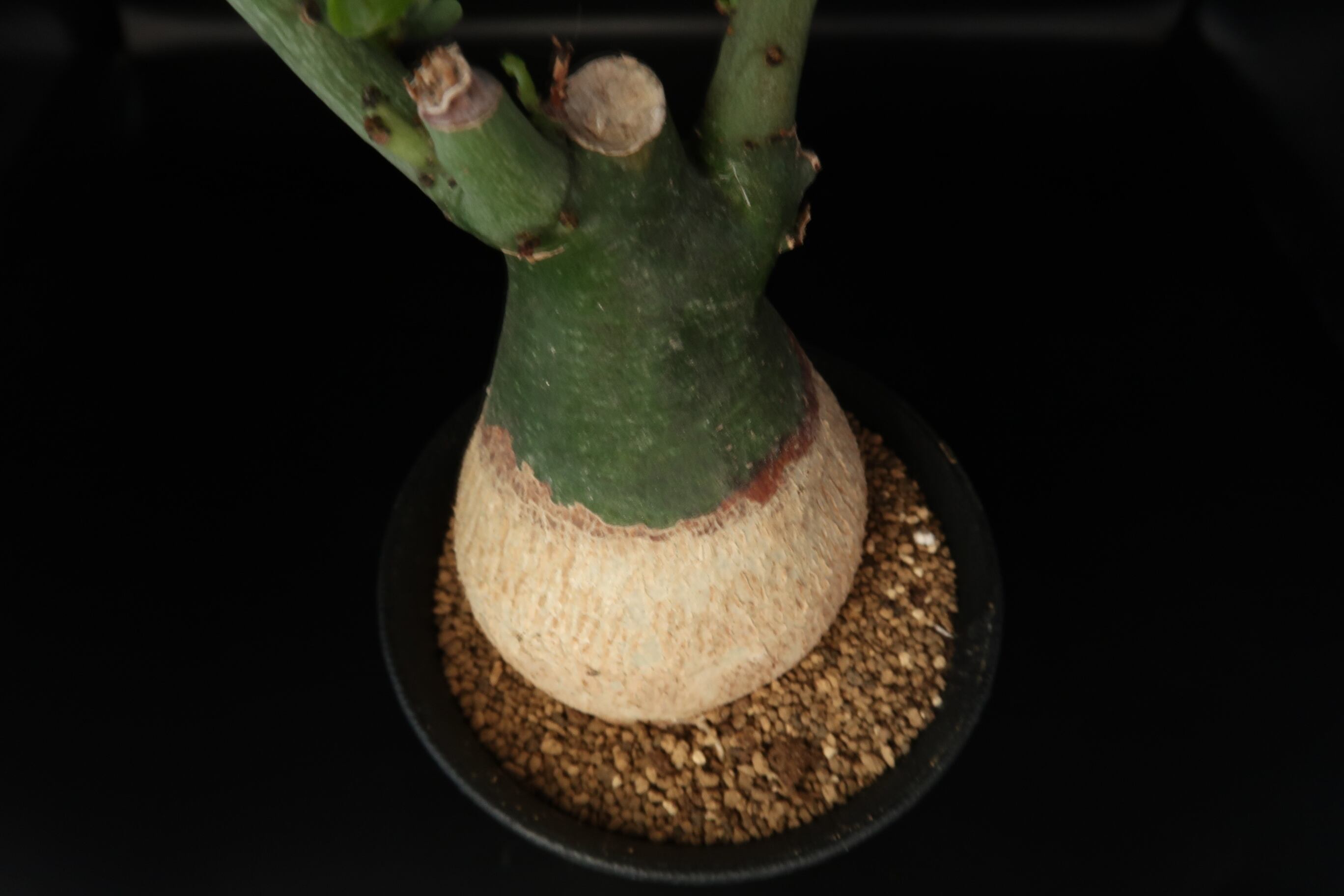 アデニアは、アフリカ大陸、マダガスカル、東南アジアに自生します。グラウカはアデニア属の代表種です。夏が生育期で、生育期にはつる性の葉がグングン伸びてきますので、適宜剪定します。塊根部が地上部では緑色で地下部では白色のツートンカラーになっているのが特徴的です。